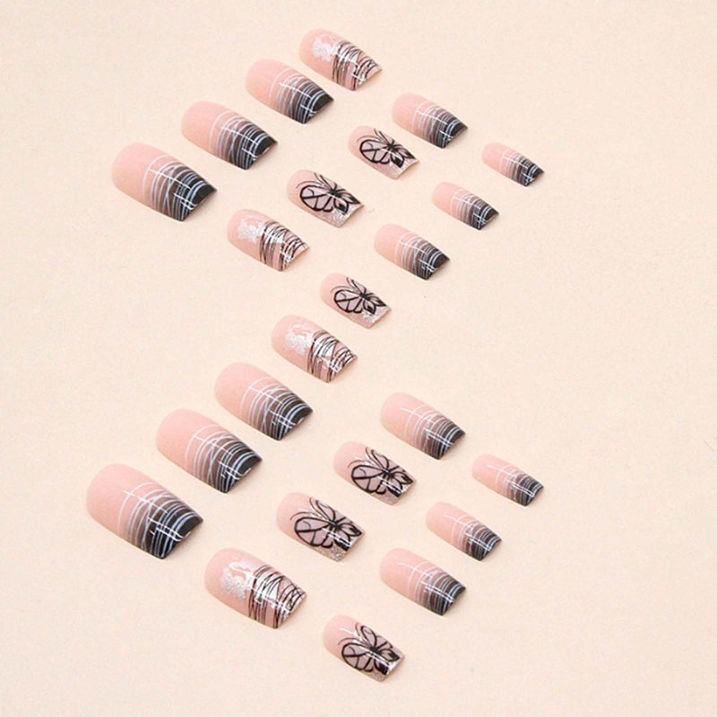 DANMANR Press on Medium Nails Line False Nails Full Cover Acrylic Butterfly Fake Gradient Square Nails for Women and Girls 24PCS