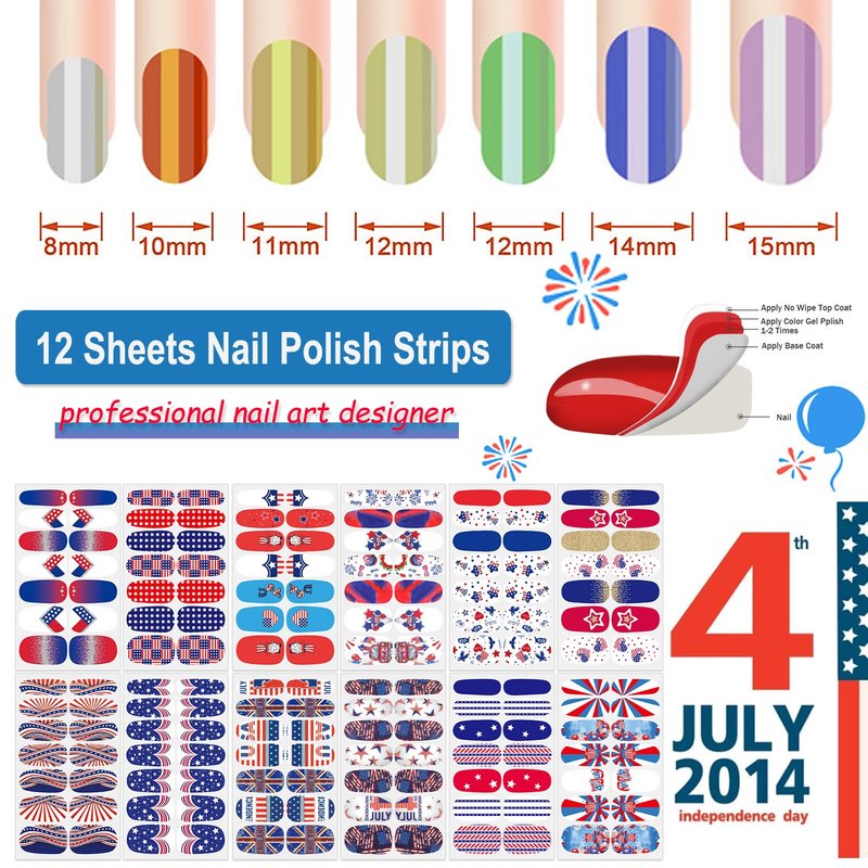 - [Package Included] You will get 12 sheets 4th of July nail strips, each nail strips has 14 pieces nail tips and 7 sizes, to suitable for most people's nail size. the attached nail file and cuticle stick will help you finish the nail work better.