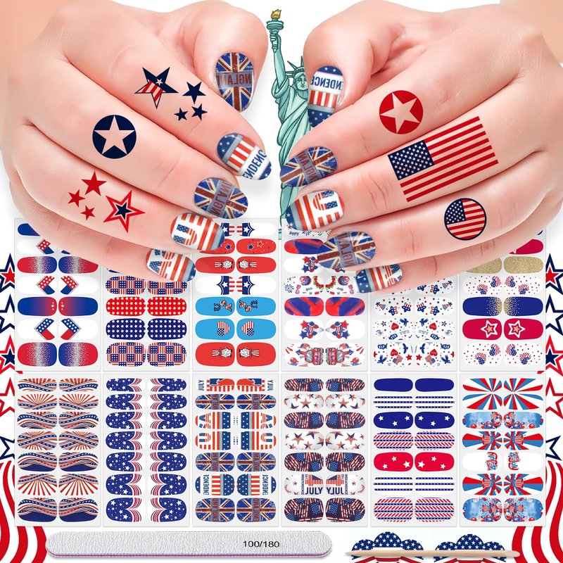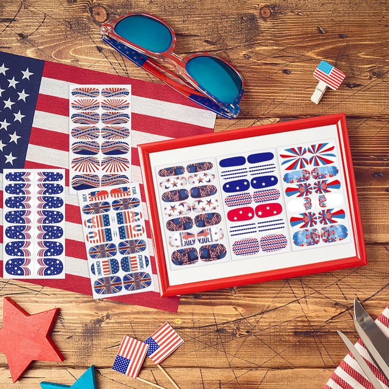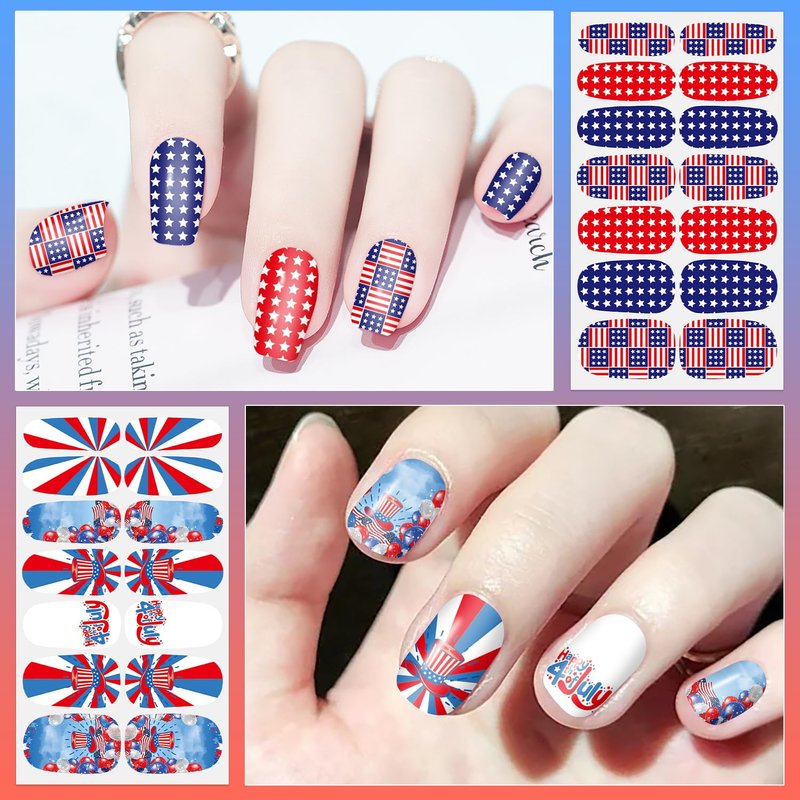- [Quality & Durable] Our 4th of July nail stickers made of quality material, safe and odorless, bringing no hurt to your nails, also the full nail strips is durable, not easy to bubble and DON'T REQUIRED UV LIGHT.