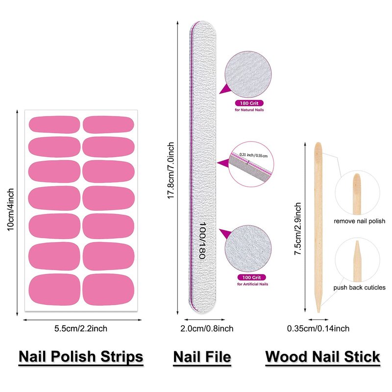 - [Package Included] 16 sheets nail polish stickers for women + 1pc nail files + 1pc wood cuticle stick. each nail strips has 14 pieces nail tips and 7 sizes, suitable for most people's nail size.
