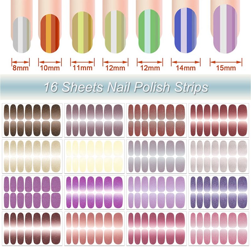 - [Package Included] 16 sheets stick on nail polish strips + 1pc nail files + 1pc wood cuticle stick. each nail strips has 14 pieces nail tips and 7 sizes, suitable for most people's nail size.