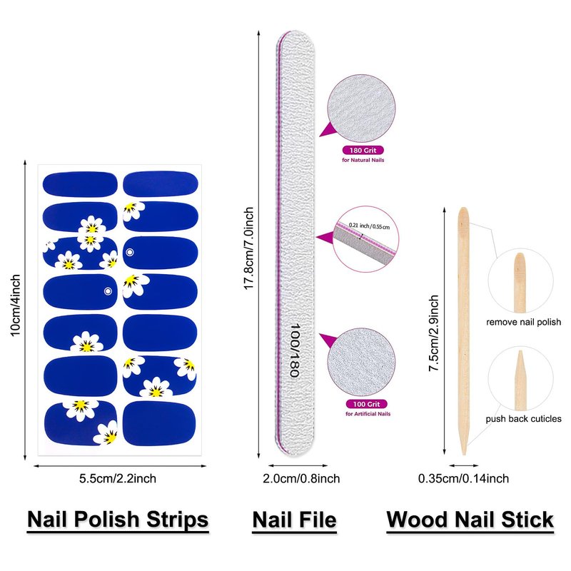 - [Package Included] You will get 30 sheets flower nail wraps with 2pcs nail file, 1pc cuticle stick, each nail strips has 14 pieces nail tips and 7 sizes, to suitable for most people's nail size. the attached nail file and cuticle stick will help you finish the nail work better.