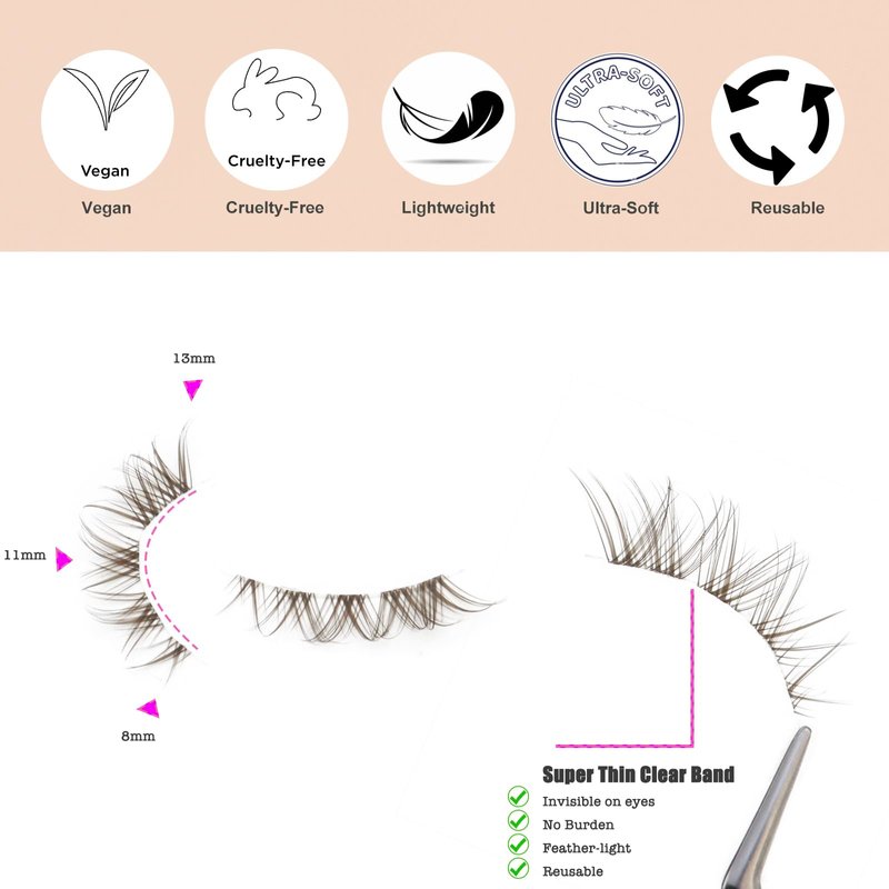 - Clear Band Feather-light: The false eyelashes are knotted with soft clear band, it is thin, (only 0.05mm thickness), super comfortable to wear. Enjoy all-day comfort with our lightweight brown lashes. You may forget that you have put on eyelashes on.