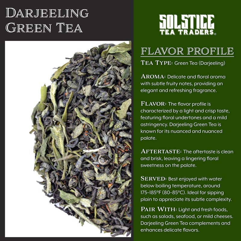 - DARJEELING GREEN TEA FANNINGS: A unique experience enjoying a green tea from the famed Darjeeling region of India. This is “fannings” which brew quickly as the leaf pieces are smaller. Also great for making cold brew green tea.