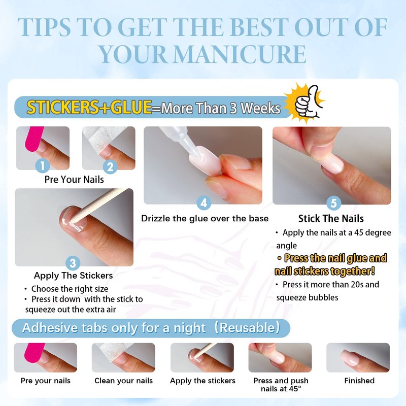 2.Please note that the nail glue is not included.If you want it last for a longer time,please use nail glue instead of the nail stickers.