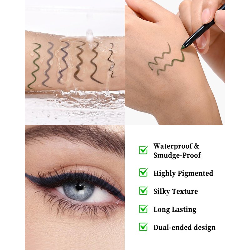 Brown, black brown, black, navy blue, grey and dark green, offer 6 different eyeliner pencil colors, waterproof highly pigmented eye liner with built-in sharpener & smudger, soft and delicate texture, lightweight, dual-ended design, waterproof and smudge-proof, safe formula, non-irritating ingredients suitable for all skin types.