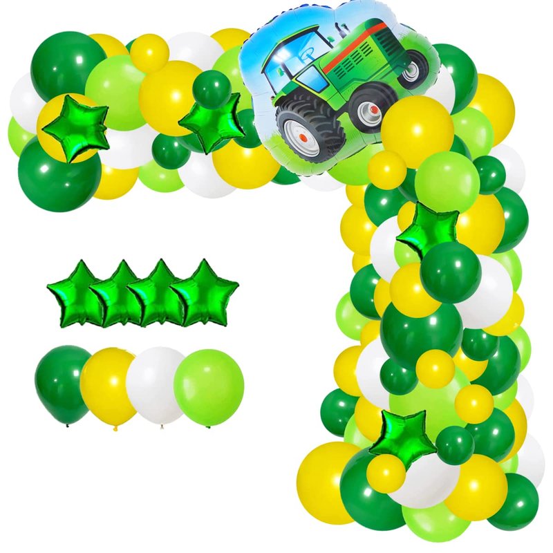 - Farm Tractor Birthday Party Decorations : You will get 117 pcs retro green yellow white balloon garland arch kit, which includes 110pcs green yellow white balloons(12in 10in 5in), 1pcs tractor foil balloon, 4pcs green star foil balloons, 1pcs balloon arch holder tool 16ft, 1pcs balloon sticker 100dots.