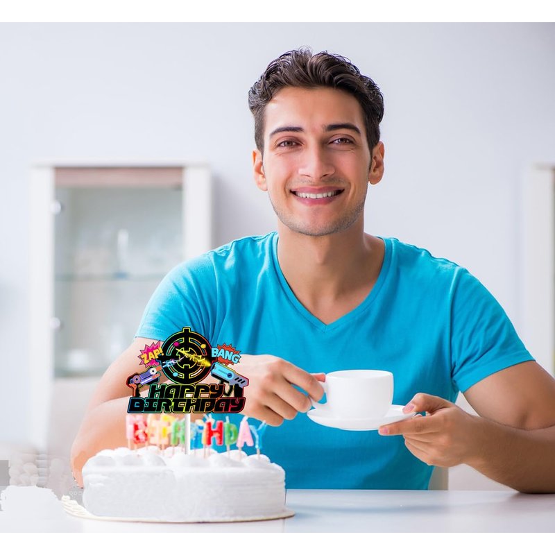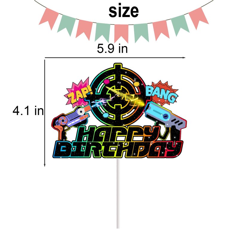 Dark Laser Game Cake Topper for Boys Girls Adult Happy Birthday Gun Game Laser Party Supplies Favors Glitter Neon Cake Decorations