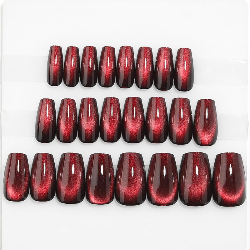 - 【Package Contains】You will get 24pcs dark red cat eye fake nails,1pcs nail file,24pcs jelly glue sticker,1pcs alcohol pad,1pcs wooden stick for removing false nails.Jelly glue is not as durable as liquid glue, but it makes fake nails reusable. Please use suitable glue according to different scenes.