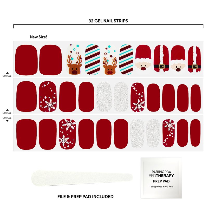 - SANTA'S HELPER: Santa's gift to you for being so glamorous this year. Red & white gel nail strips featuring reindeer icons, snowflakes, and Santa theme accents with a glossy, high-shine finish