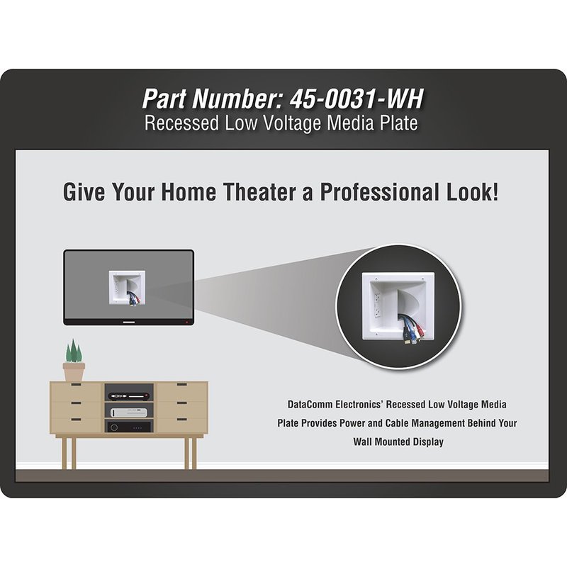 DATA COMM Electronic 45-0031-WH Recessed Low Voltage Media Wall Plate w/ Built-In Duplex Receptacle Outlet, Cable Management - Elevate Your Home Entertainment w/ Stylish White Panel