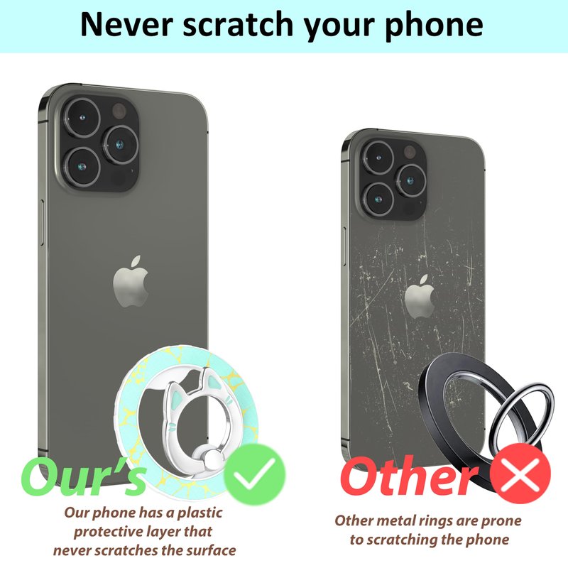 - 【Super Strong Magnetic】Lightweight ring holder provides amazing 70.5oz (2000g) magnetic power which sticks to your iphone 16 15/14/13/12 tightly.just move it to the back of your Phone,It will automatically snaps into place with a clear “thwoong” sound, you will impressed by the magical attach and detach experience.