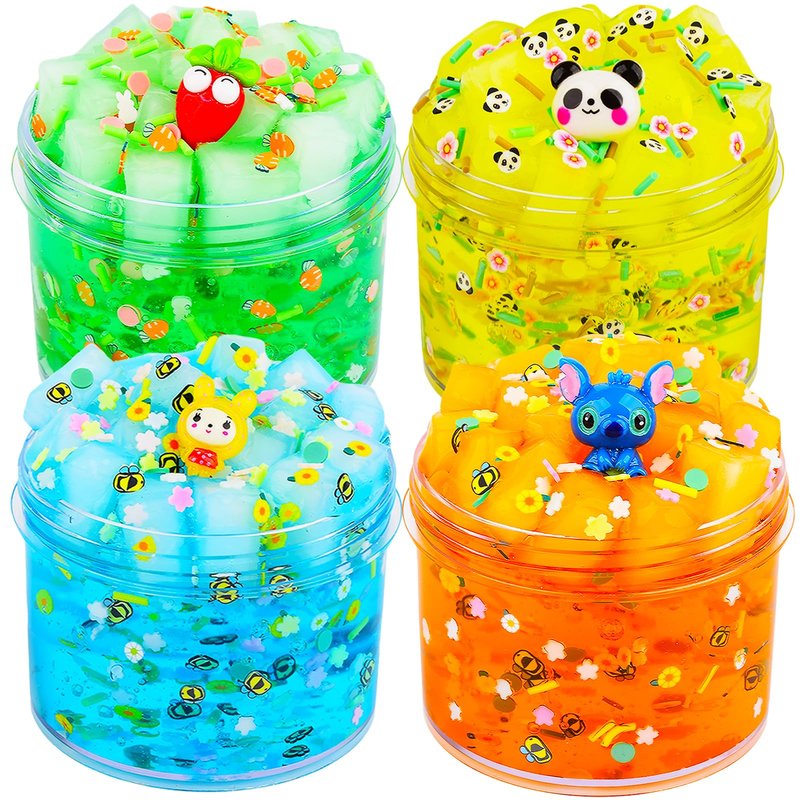 - 🎁 Fun 4 Jelly Cube Crunchy Slime Kit, with cute slime charms, ready to play right out of the slime containers, This color slime is super stretchy, soft, not sticky, does not tear when you stretch, will be more perfect with slime charms!