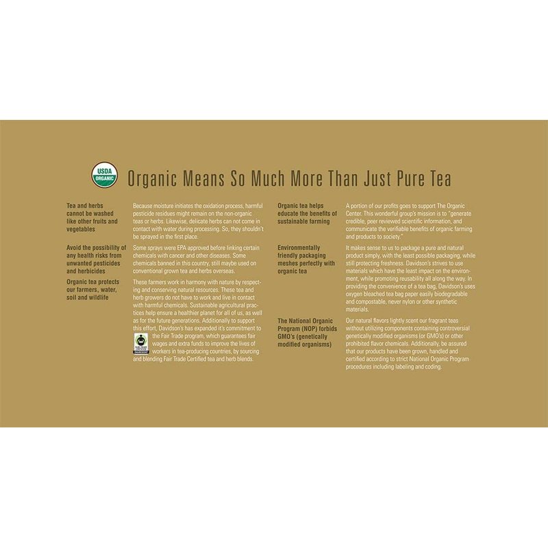 - ALWAYS ORGANIC: Davidson’s Organics is a 3rd generation organic tea grower delivering on its promise of providing top-notch USDA certified organic teas. Our teas are grown non-GMO & free from harmful chemicals and pesticides. We are responsibly sourced and sustainably farmed. We believe in the holistic health of our farms, farmers, plants & animals.