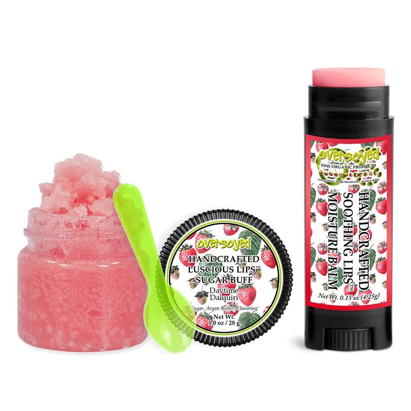 Daytime Daiquiri Soothing & Luscious Lips by OverSoyed Exfoliator & Chapped Lip Repair Lip Care Combo | Artisan Handcrafted to Order Frosty Strawberry Citrus Flavored Exfoliating Sugar Lip Scrub & Lip Moisturizer Balm Gift Set