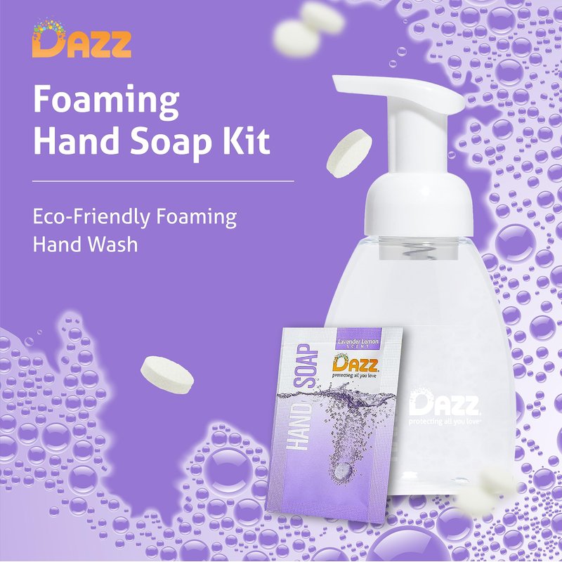 Dazz Foaming Hand Soap Starter Kit Eco Friendly Refillable Foam Hand Wash - Includes 2 Refill Packets + 8.5oz Foam Hand Soap Pump - Lavender-Lemon Scent - Fits All Glass Foaming Pumpers