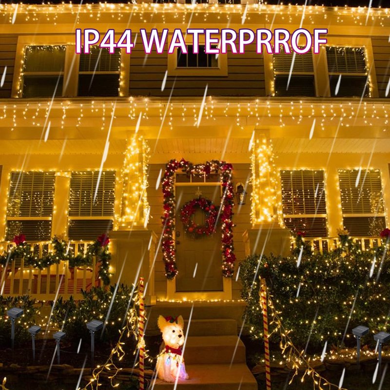 - 'IP 44 Waterproof Level: Both the solar string lights and solar panel are IP44 Water proof, the silver wire is anti-rust suitable for outdoor decorating. It can withstand all kind of weather, no worries about rain, snow, frost, or sleet.'