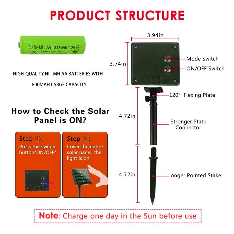 - Solar Powered Garden Lights: Powered by solar, it can work for 10 to 14 hrs after fully charged. Note: The charging efficiency depends on the weather. Each solar panel is equipped with Ni-MH AA 800m AH battery, which has large capacity for whole night lighting require. Please turn on switch before charging and the string light will automatic illuminate at dark and off at dawn.