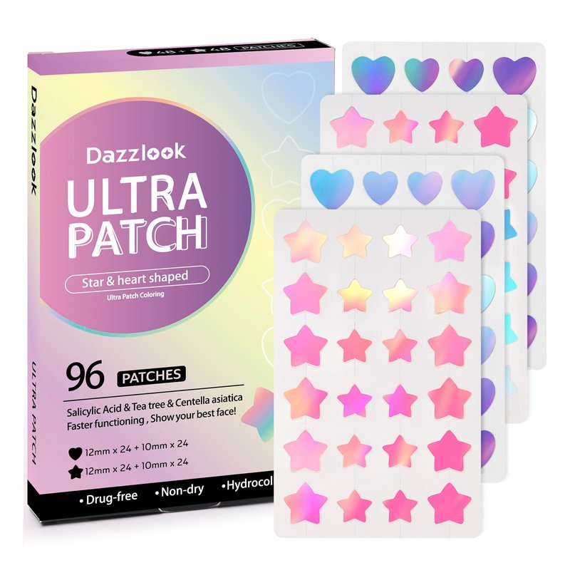 Dazzlook Star Acne Patch with Salicylic Acid Tea Tree Oil & Centella Asiatica, Hydrocolloid Pimple Stickers Iridescent Colors 96 Pcs 2 Sizes, Cute Star Heart Shaped Zits Blemishes Breakouts Patches