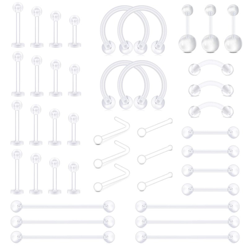- ✿[Total 38pcs] * 4pcs horseshoe septum retainer, * 12pcs clear lip rings, * 3pcs clear curved barbell eyebrow rings, * 3pcs belly piercing retainer, * 6pcs clear nose studs, * 6pcs industrial piercing retainer, * 4pcs clear tongue rings