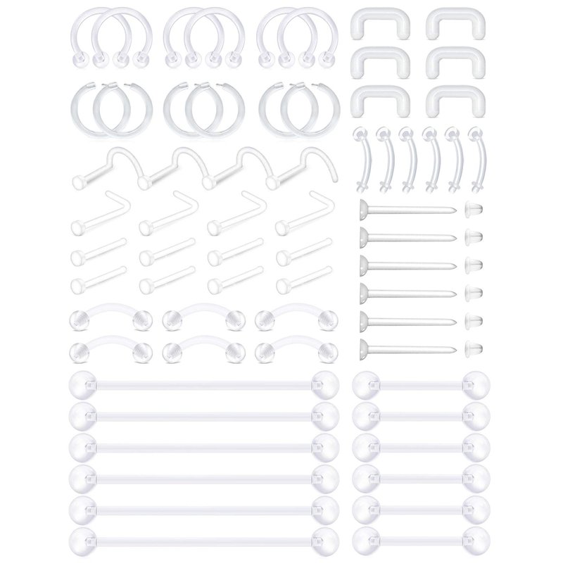- [Total 64pcs] * 16pcs clear nose studs, * 6pcs U shape septum retainer, * 6pcs clear belly rings, * 6pcs clicker nose retainer, * 6pcs horseshoe nose rings hoop retainer, * 6pcs stud earring retainer, * 6pcs clear eyebrow rings, * 6pcs industrial piercing retainer, * 6pcs clear tongue ring