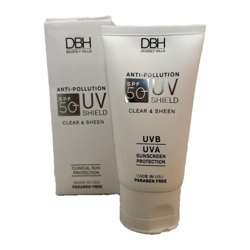 DBH Dermaesthetics UV Shield | Anti-Pollution SPF 50 | Clear & Sheen UVB/UBA Sun protection | Paraben Free. Made in USA 2oz