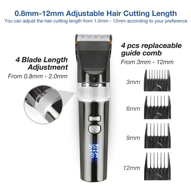 - Adjustable Cutting Hair Length:You can left or right rotate the adjusting ring to adjust the haircut length from 0.8mm to 2.0mm. Or use 4 guide combs (3/6/9/12mm) to adjust the hair cutting length according to your preference.