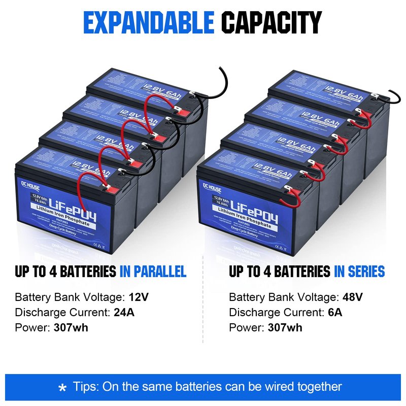 - [Capacity Expansion]: The lithium battery can be used not only in parallel connections but also in series. It involves up to 4 identical batteries for connection in series and unlimited batteries in parallel.