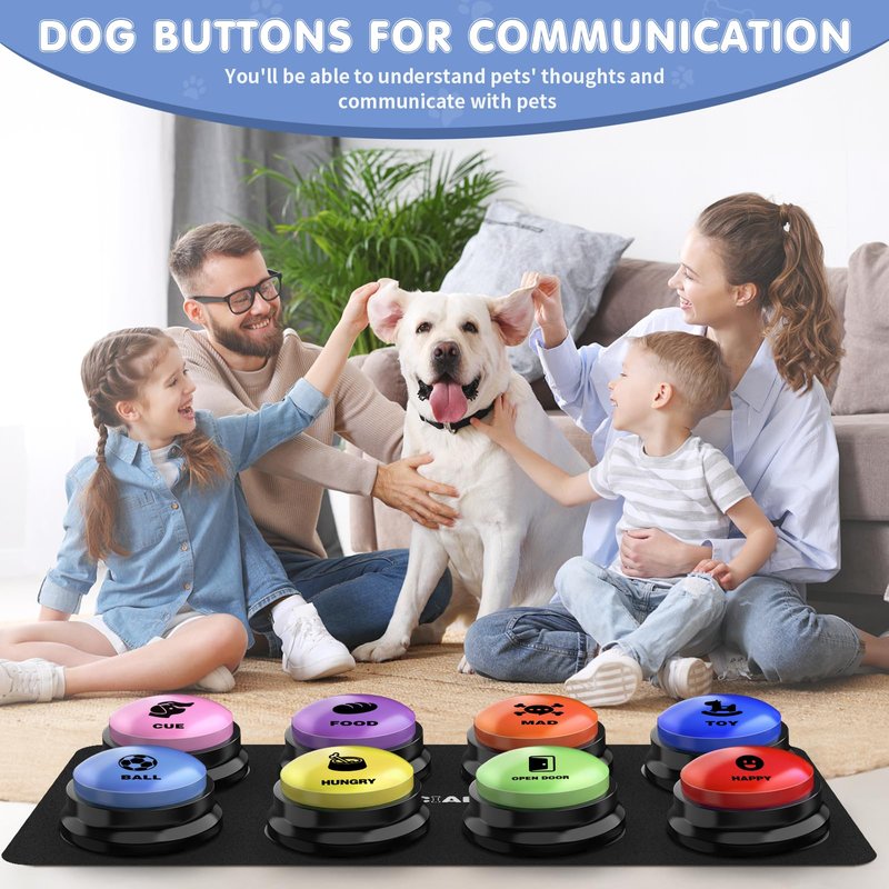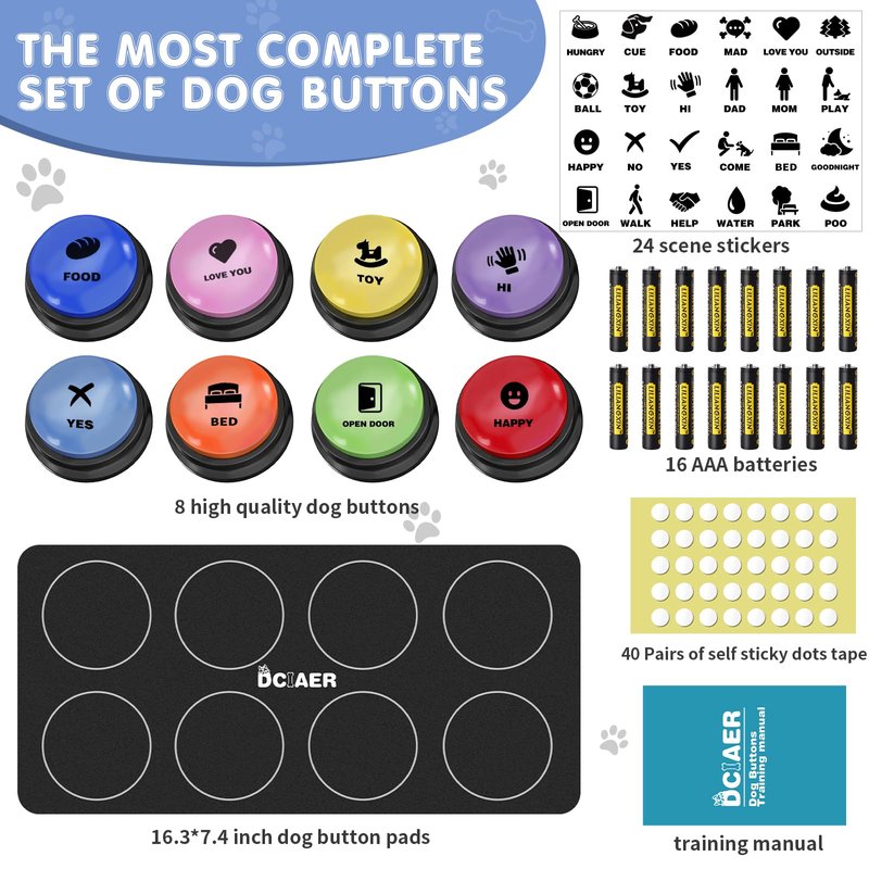- 🐾【Perfect Set】 -8 different bright colors are enough to satisfy your daily use and playback volume more loud and clearer. The set contains 8 high-quality button+ training manual +16 AAA battery+ 24 scenes. Pattern+ 1 waterproof dog activity pad+ 40 double -sided stickers. Repeated recording, perfect gift set of pet toys.