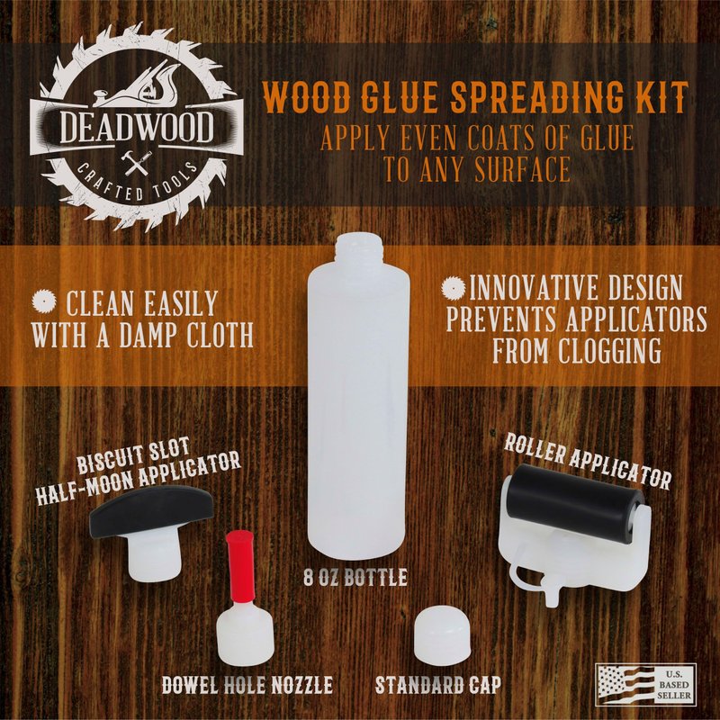 - EVENLY APPLY GLUE: Use the DCT Wood Glue Spreading Woodworking Kit – 8 oz ounce Bottle, Roller Applicator, Dowel Hole Nozzle, Biscuit Slot Tip to apply even coats of glue on any surface; It is a lifesaver for extensive glue ups such as building cabinets and more; This glue bottle applicator set will cover more surface area which means better glue joints on your application