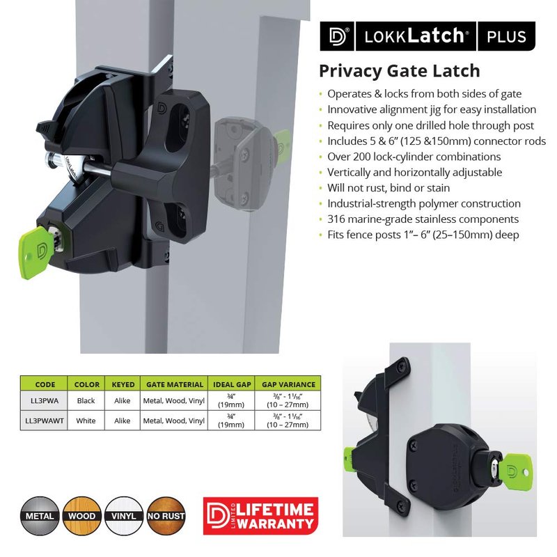 D&D Technologies LL3PWA LokkLatch Plus, Locking Privacy Gate Gravity Latch, Key Lockable on Both Sides of Gate, for Metal, Wood, and Vinyl Fences, Black