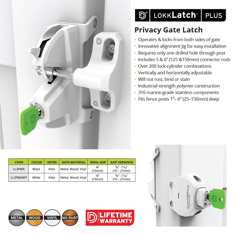 D&D Technologies LL3PWAWT LokkLatch Plus, Locking Privacy Gate Gravity Latch, Key Lockable on Both Sides of Gate, for Metal, Wood, and Vinyl Fences, White