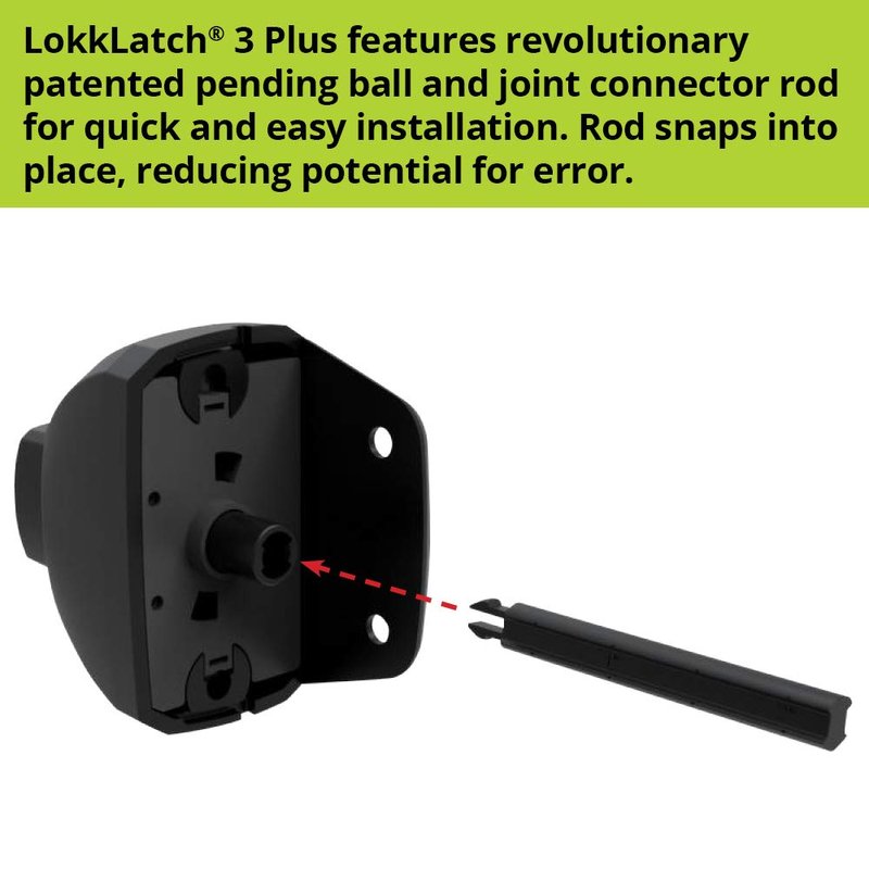 The LokkLatch Plus privacy and security gate latch operates and locks from both sides of the gate. With templates provided along with revolutionary ball and joint connector rod, the LokkLatch snaps firmly into place, reducing potential for error. Simply drill one hole through the post for fast and accurate front and side installation.