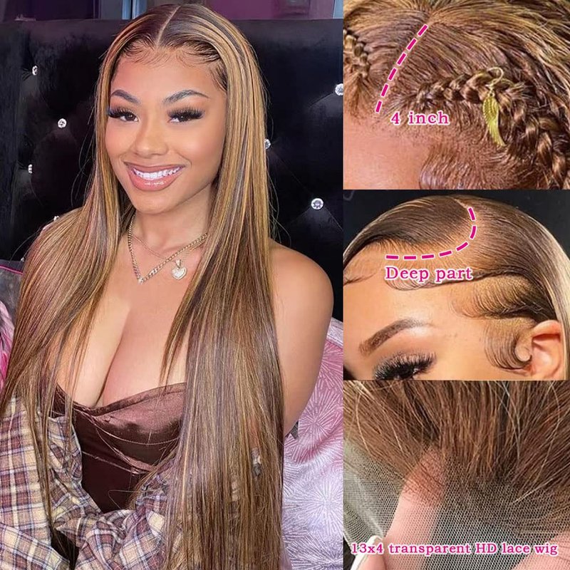 【Highlight lace front wig human hair material】100% Brazilian virgin human hair, soft and healthy, comfortable to wear. 180% density, full and thick, free shedding, no tangle, no smell. 【Ombre lace front wig human hair texture】4/27 colored straight wigs human hair pre plucked with baby hair for black women to make your hairline look more natural. It is a very popular style. 【Honey blonde lace front wig】Highlight ombre human hair wigs have transparent invisible HD lace, 4 combs and 2 adjustable elastic straps, average cap size (21.5 - 22.5 inch), fit most customers head perfectly, easy to wear. 【Wig advantage】13x4 Ear to ear straight lace frontal wigs human hair, 4 inch parting space. Free Part, can be restyled to middle part or side part as you wish. Suitable for many occasions. 【Packaging & Service】You will get: 1 highlight lace front wig human hair & 2 pcs wig caps & 1 pair of eyelashes. We have our own wig factory and R & D technology, our factory has more than twenty years of human hair manufacturing experience, based on customer needs, your satisfaction has always been our service purpose.