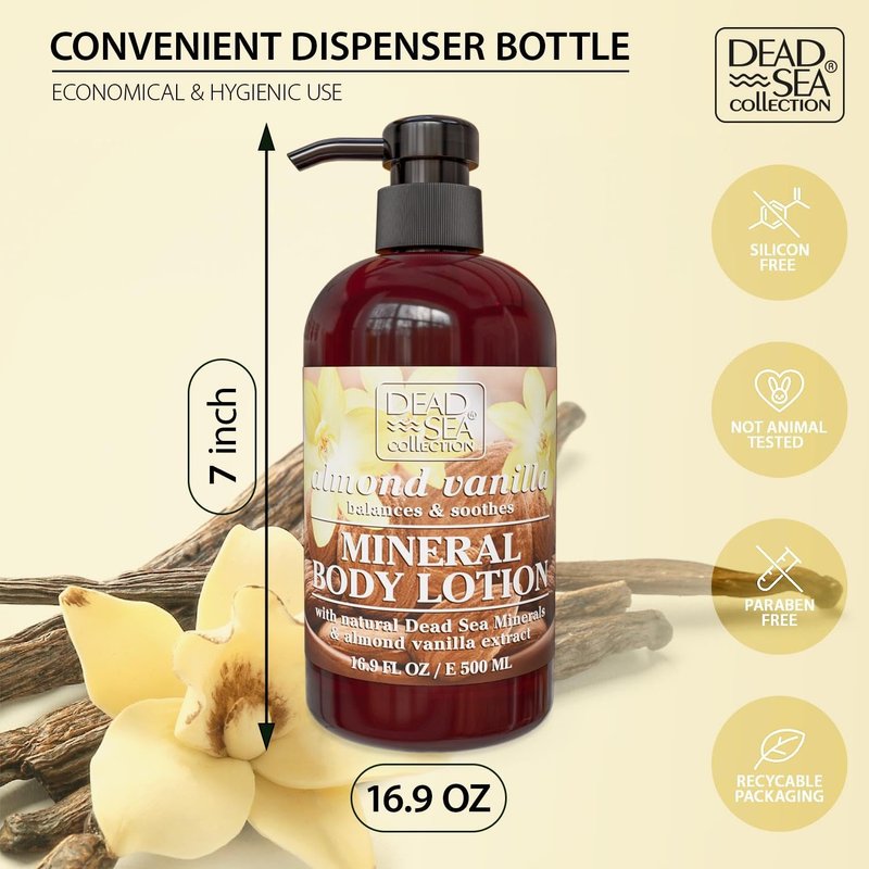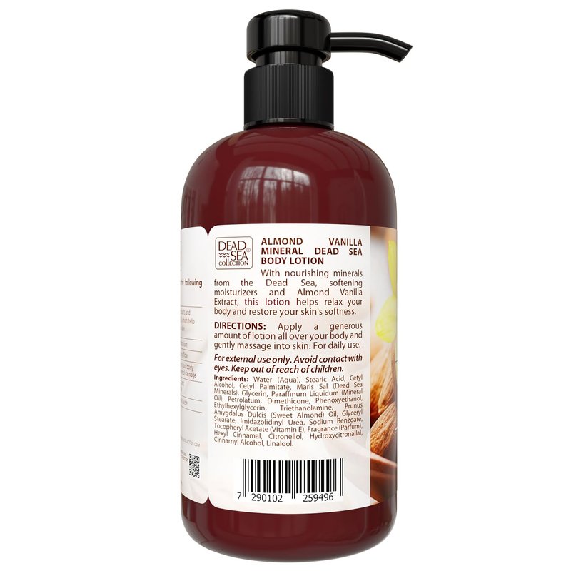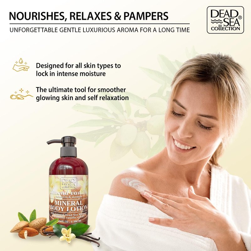 - Intensive Hydration - Dead Sea Collection almond vanilla body lotion, a potent moisturizer for dry skin, offers deep hydration for lasting comfort.