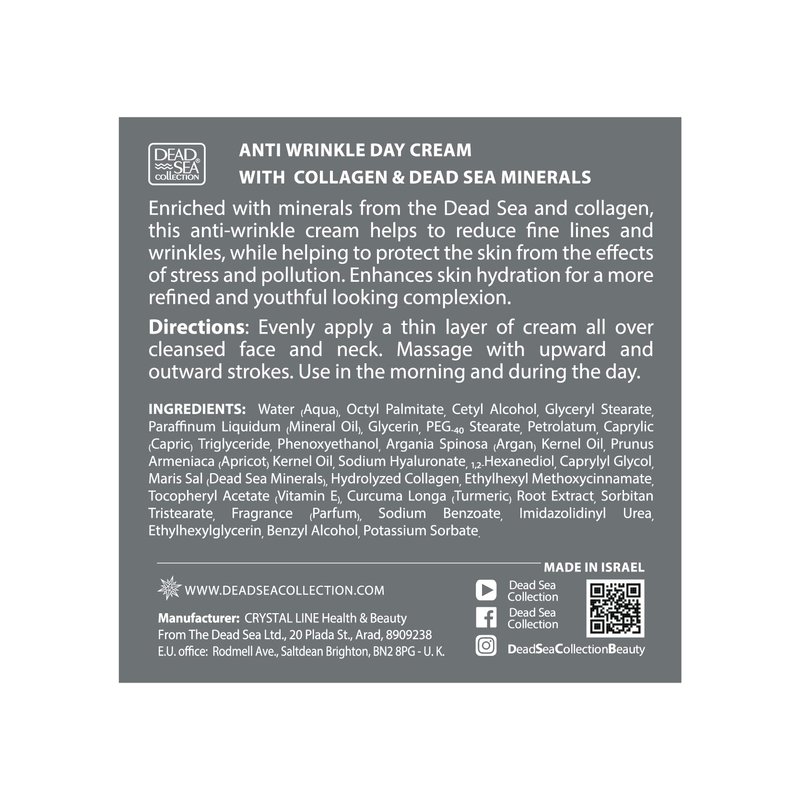 - Face cream with Collagen - our anti-wrinkle day cream for women with pure Dead Sea minerals, Vitamins A/E and Collagen moisturizer is specially formulated to deeply hydrate, rejuvenate and restore your skin. Our firming face cream locks in moisture, reducing the appearance of wrinkles and crease lines. The Collagen will leave your face looking smoother, fresher, and more supple!