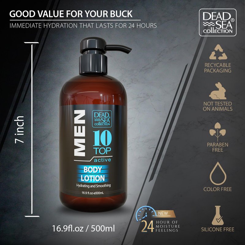 - Intensive Hydration - Dead Sea Collection Men's Top 10 Body Lotion, a potent moisturizer for dry skin, offers deep hydration for lasting comfort.
