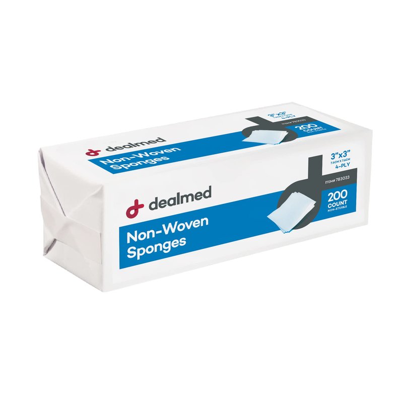 - Reliable Use: Dealmed Non-Woven Sponges are all conveniently packaged in 200 count sleeves. For quick and easy use, simply pull down one end for access. They are designed with no exposed raw edges for superior quality. Made of cotton, the sponges provide maximum absorption for ultimate wound care.