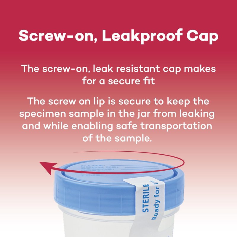 - Screw-on, Leakproof Cap: The screw-on, leak resistant cap makes for a secure fit on this plastic specimen container, great for keeping your specimen secure and protected during transportation. The secure feature of the cups keeps the specimen in the jar from leaking and also enables safe transportation of the sample.