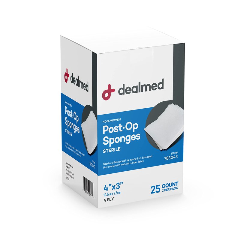 - Dealmed Sterile Post-Op Gauze Sponges – 4-Ply, 4’’ x 3’’ Gauze Pads, Packages of Two, Individually Wrapped Non-Woven Gauze Sponges, Wound Care Product for First Aid Kit/Medical Facilities (25 Sponges per Box)