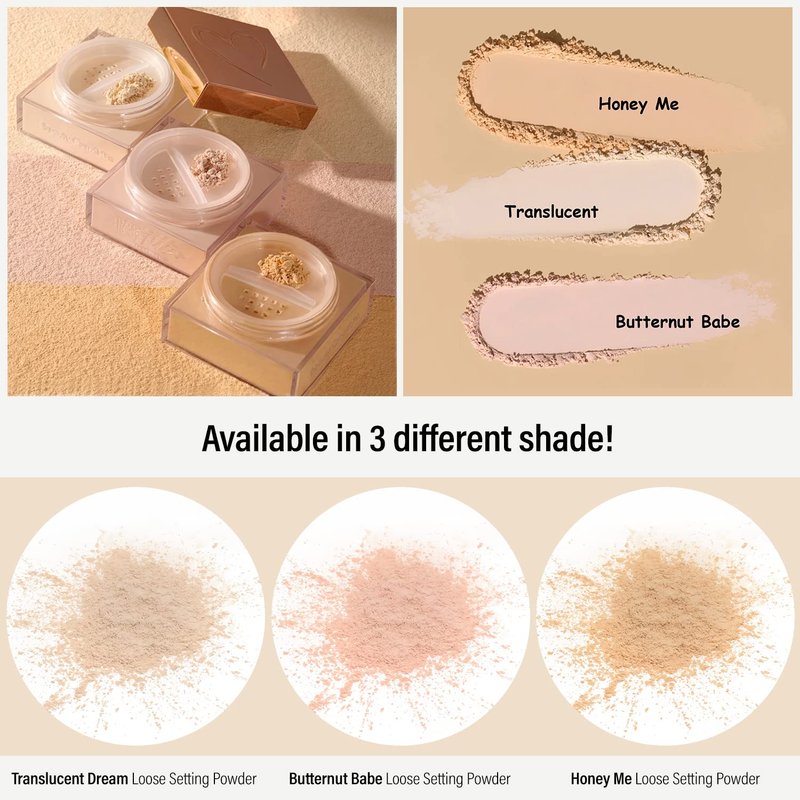- CHOOSE FROM 3 COLORS – This collection of setting powder is available in 3 different shades: Butternut Babe pink undertone for light to fair skin tones, Honey Me warm gold for medium to deep skin tones, and bright pale Translucent Dream for fair to medium complexions. Each color blends seamlessly well with your skin to set your makeup and adds a shiny glow. It’s a versatile everyday essential as it can be worn alone, over an entire face of makeup, or dabbed on top of makeup as a highlight.
