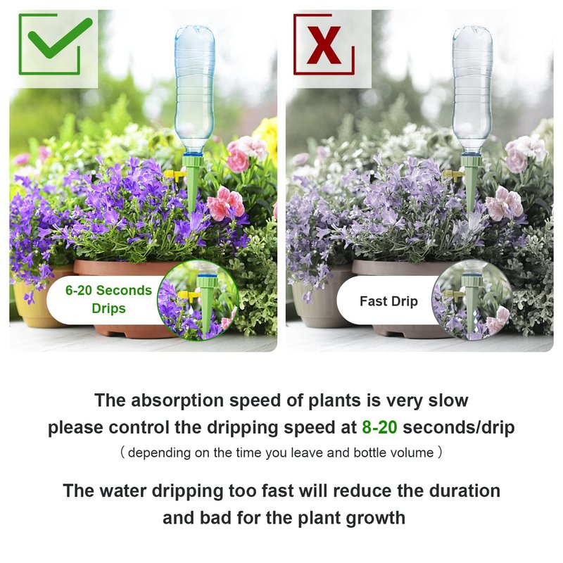 - š§ćADJUSTABLE VALVEćThe vacation slow drip planter waterer with adjustable valve can control the drip rate between 0-60s/drip freely. It usually slows down with the time so you may test it few times before best results. Don't worry about your plants withering during travel for business or travel on holiday.