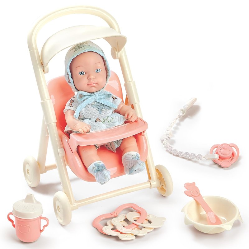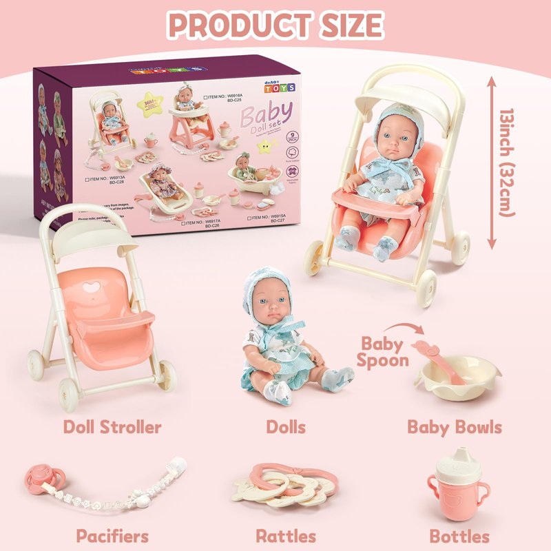 deAO Baby Doll Stroller Set,Kids Play Stroller Toys,9 inch Soft Baby Dolls Toys with Trolleys,Bottle,Pretend Play Toys Gifts for Age 3 4 5 6 Girls