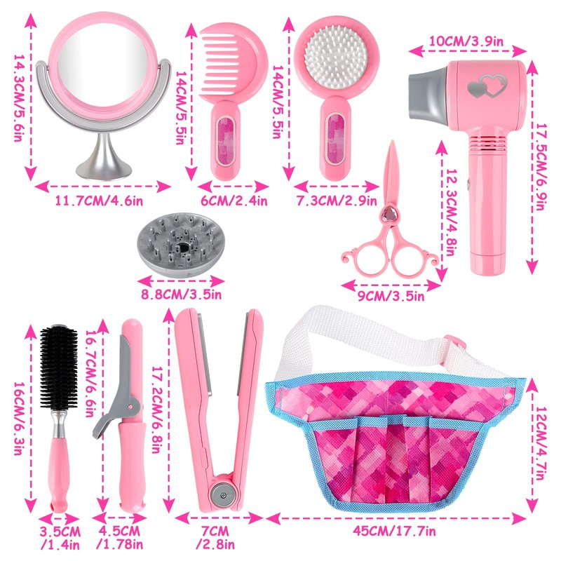 - 💈 Beauty Hairdresser Salon Kit - deAO salon kit toy includes 35 Pcs kids barber set toys, including a hairdryer with hair dryer, dressing bag, mirror, nail polishes, lipstick, hair scissors, combs, hair curler, hair straightener, hair rollers, perfume bottle, bottles, makeup brushes, hair ties, hair clips, stylish belt. This Pretend Beauty Salon Set for Kids is a complete set of pretend toy. It does not contain any liquid, paste or powder.