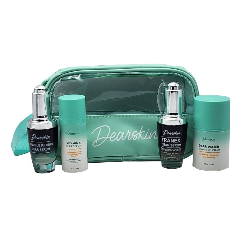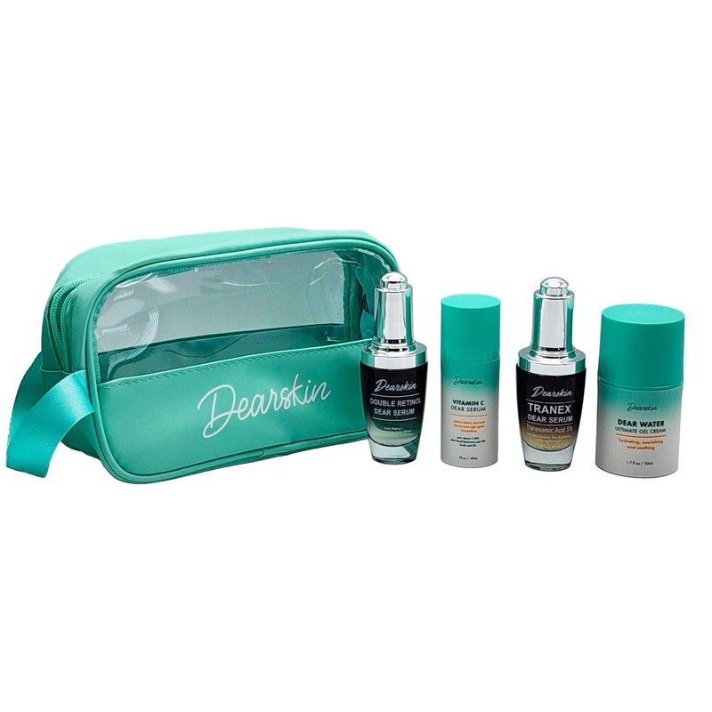 Introducing the Dearskin Radiant Glowing Skincare Gift Set: Unveil Your Radiance with the Power of Double Retinol Dear Serum, Vitamin C Dear Serum, Tanex Dear Serum, and Dear Water Ultimate Gel Cream!