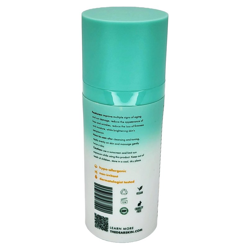 By offering a constant supply of these ingredients Vitamin C Dear Serum helps your skin to be healthy and young for the long term. Extra protection against UV exposure: Although Vitamin C Dear Serum is not effective to block UV rays the regular use of Vitamin C Dear Serum reduces the oxidation damage to the skin and slows the rate of free radical damage caused by sun exposition. Fades dark spots and brightens skin: Vitamin C Dear Serum Inhibit the synthesis of melanin, the pigment that attributes color to your skin, dark spots are the effect of unbalance in melanin production.