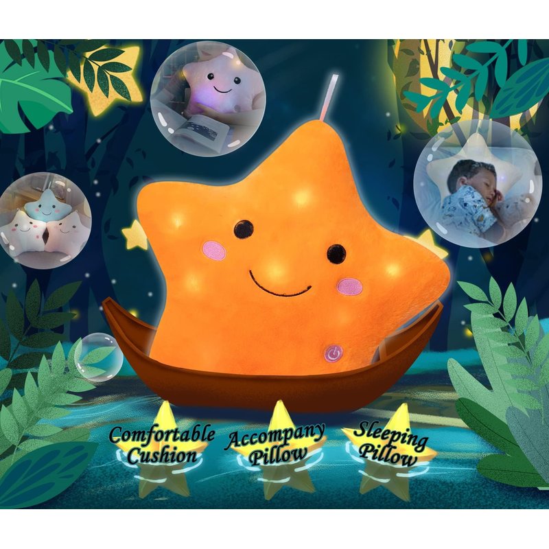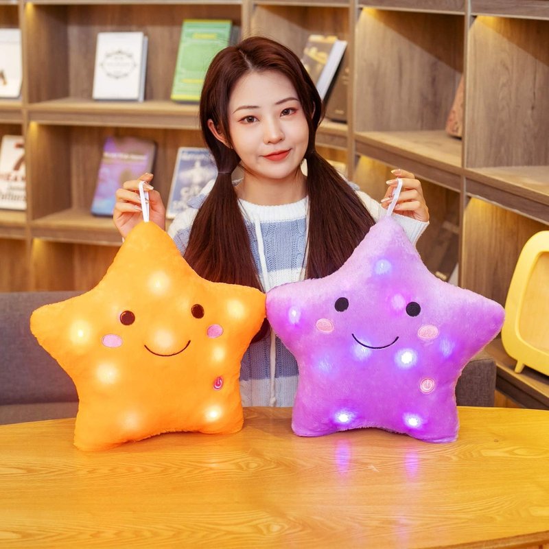 - This is a good plush pillow to show your kids that what is a star and how to shine. Turn on the press on Star and the light will turn off in 15 minutes automatically.