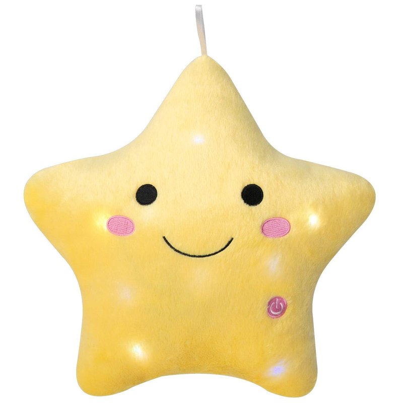 - There is a switch button in the lower right corner of the pillow. Upon pressing the button, the pillow will light up and cycling through a spectrum of colors, adding a touch of fun to bedtime. Pressing the switch again will turn it off. If forgotten turn off, the clever star automatically dims after 15 minutes. Please note that avoid submerging in water due to the installed LED light. Powered by 2 AA batteries (not included).