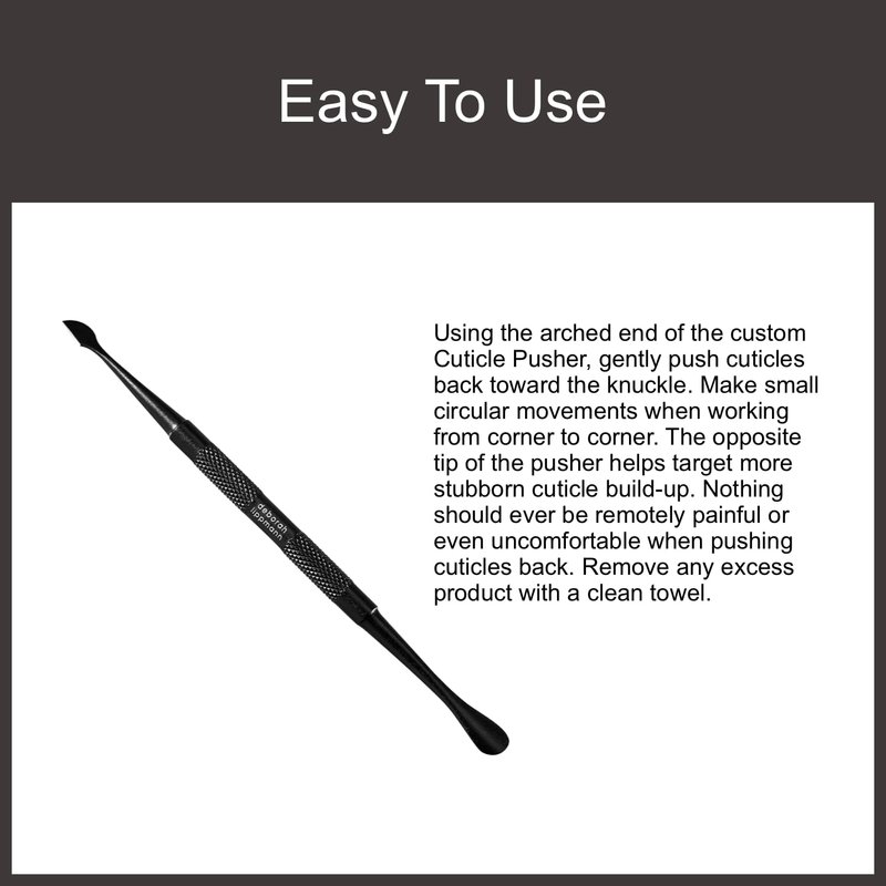- HOW TO USE: Using the arched end of the custom Cuticle Pusher, gently push cuticles back toward the knuckle. Make small circular movements when working from corner to corner. The opposite tip of the pusher helps target more stubborn cuticle build-up. Nothing should ever be remotely painful or even uncomfortable when pushing cuticles back. Remove any excess product with a clean towel.