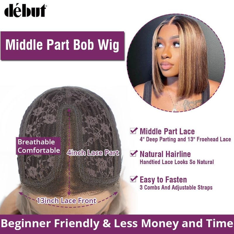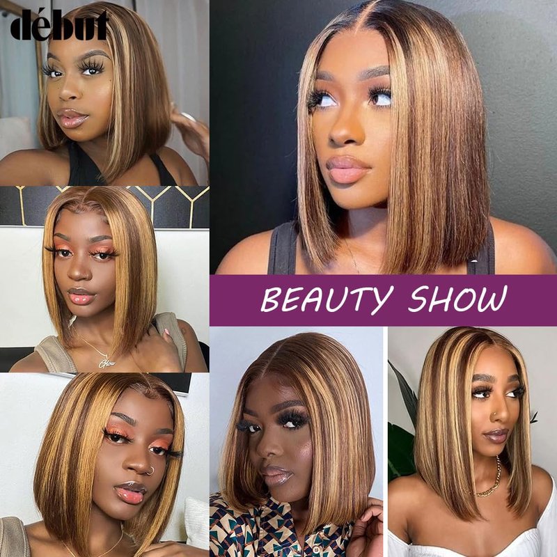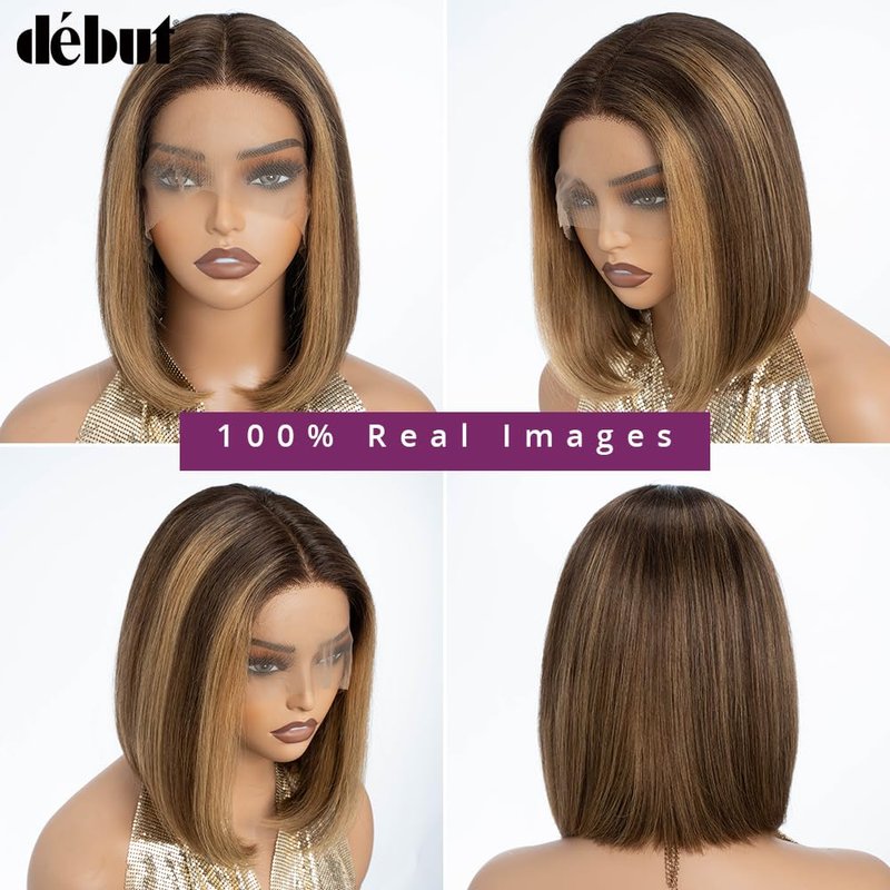 DÉBUT Short Bob Ombre Highlight Blonde Brown Lace Front Wigs Human Hair Wigs Middle Part Wigs Brazilian Virgin Straight Hair 13x4x1 T Part Wigs for Black Women Piano Color 10 Inches